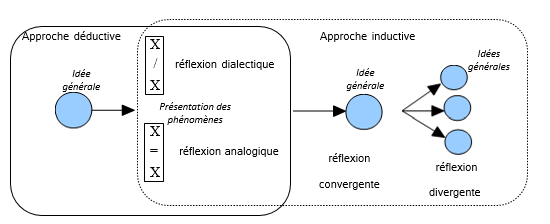 Dans une approche déductive, l’idée générale est posée à priori puis elle peut déboucher sur une réflexion mettant en avant les oppositions ou les rapprochements possibles au sein des phénomènes étudiés. Dans une réflexion inductive, ces deux grandes catégories sont la base de la recherche d’une idée globale ou d’analyses divergentes. Ce cadre très général n’est bien entendu qu’un support à des mises en œuvre fort diverses et plus nuancées.