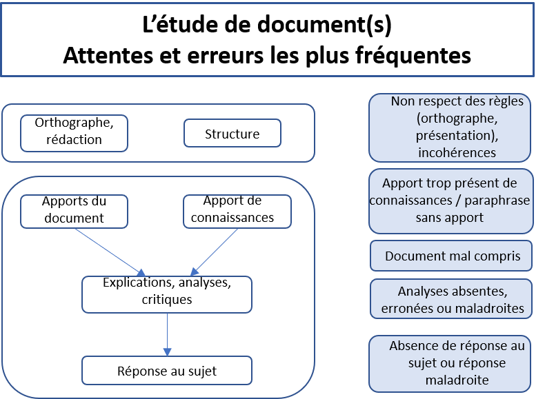 - L’étude critique de document(s) est donc particulièrement ardue pour les élèves. Les insuffisances observées dans les copies découlent de la liste des compétences mise en œuvre, et entrent donc le plus souvent dans les catégories indiquées dans le schéma ci-dessous. On constate que les lacunes peuvent venir de la focalisation sur un stade de l’étude (souvent le premier), ce qu’il est assez facile de faire identifier et corriger ; plus difficile est le cas d’élèves ayant saisi les différentes étapes, mais étant trop rapides, voire superficiels sur chacune d’icelles.
