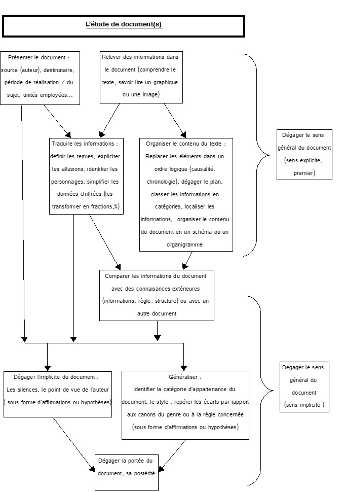 Plusieurs approches sont possibles, avec des effets de mode : critique interne / critique externe, approche par questions de lecture de plus en plus complexes jusqu’à la synthèse d’ensemble, et désormais approche globale du sens du document suivie d’une justification. Si les deux premières méthodes ont moins cours, elles demeurent intéressantes pour, lors d’exercices intermédiaires, apporter des briques de méthode aux élèves.