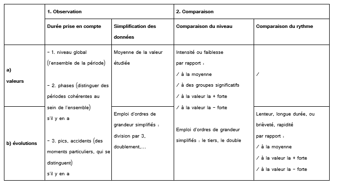 L’étude de statistiques ou de graphiques nécessite des gestes techniques particuliers. Le tableau ci-dessous en présente une bonne part. Il va sans dire qu’aucun élève ne peut retenir et mettre en œuvre un tel ensemble de consignes ! Pour relever le défi, rien de tel que d’inverser le problème : demander aux élèves ce qui ressort du document, puis leur demander d’abord à quoi ils l’ont vu sur le document, puis en quoi c’est visiblement important, et enfin en quoi la présentation du document peut avoir pesé sur leur jugement (possible manipulation ?). Rien n’empêche de fournir ce tableau par ailleurs en boîte à outils, ou de le faire construire par accumulation des expériences des élèves, mais rien ne vaut un regard critique qui finira bien par trouver ses outils.