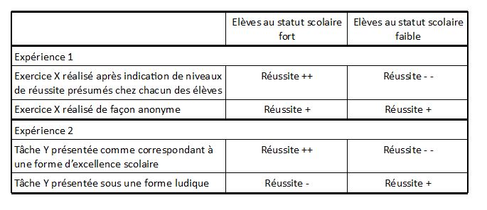 Les élèves se considérant comme en difficulté fuient la compétition et partent avec peu d’espoir et peu de motivation; ils minimisent la souffrance ultérieure qu’ils anticipent. En revanche, les élèves en réussite sont très motivés par la compétition, et négligent ce qui leur est présenté comme facile, comme le montre le tableau ci-dessous [8] :