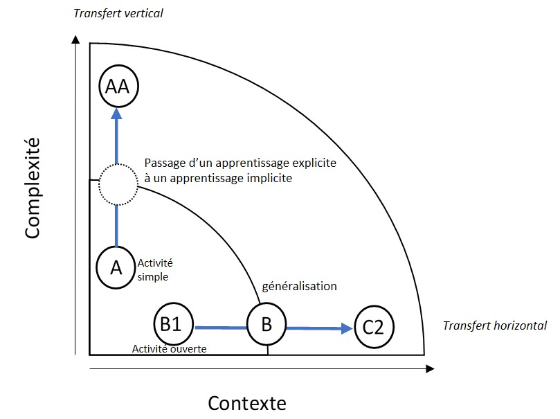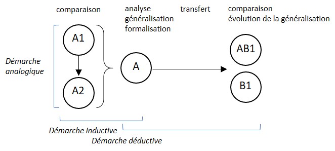 Cette phase inductive ouvre la possibilité au transfert, qui va voir l’application du savoir acquis à une situation dont le contexte est différent dans un transfert proche (le domaine est connexe, ici AB1) ou éloigné (le domaine est différent, ici B1), ce qui va ouvrir soit à une généralisation modifiée, soit à une comparaison cette fois-ci efficiente.