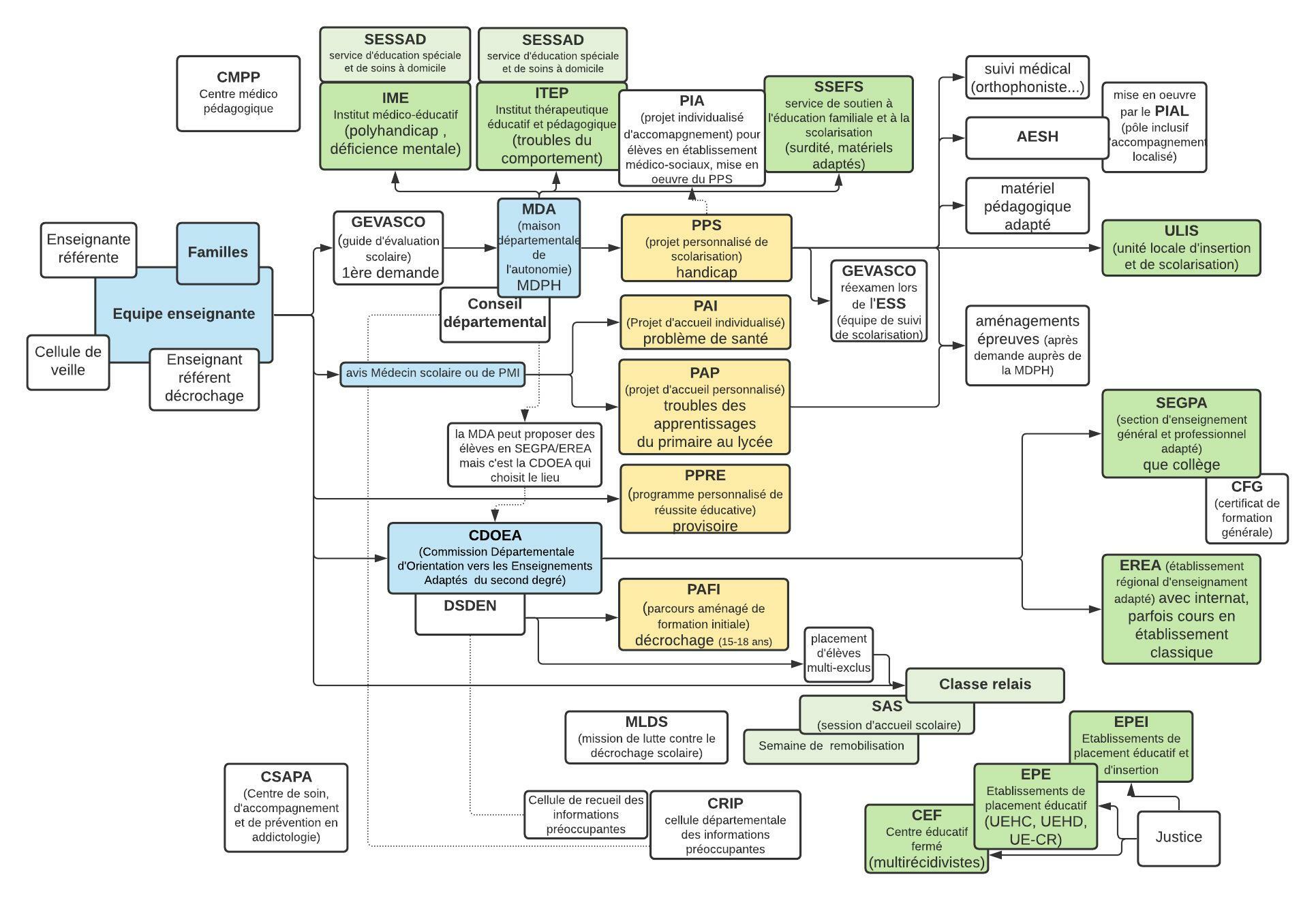 Pour avoir un premier regard sur la kyrielle de réponses recherchées, selon que l’élève a des difficultés relevant du handicap, du trouble psychologiques, des troubles « dys », de difficultés scolaires, de difficultés comportementales (pouvant aller jusqu’à la justice), voici une ébauche de schéma, forcément partiel ou inexact puisque chaque département a ses propres noms de structures.