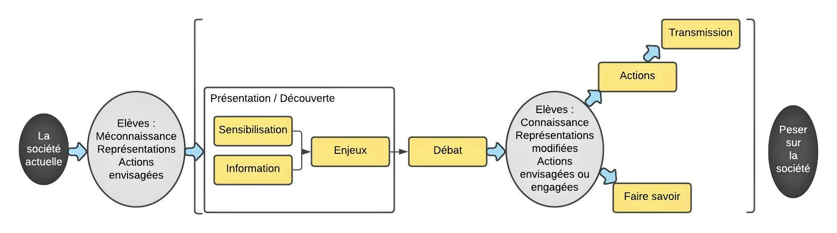 Modalités privilégiées: jeu de rôles avec prise de décision collective, réalisation d’un projet de groupe/de classe, soumission d’un projet à des acteurs de terrain, exposition dans des espaces publics, article dans la presse locale