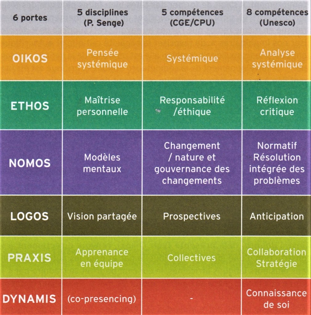 Comme pour toute activité pédagogique, il importe dans un premier temps de déterminer les compétences visées. Le « Manuel de la grande transition, former pour transformer »[2] affirme qu’un enseignement visant une transition écologique se doit de développer un bouquet de compétences complémentaires afin de permettre le changement de paradigme. Un tableau est proposé, croisant les préconisations de l’UNESCO (L’éducation en vue des Objectifs de développement durable, 2017), de la Conférence des Grandes écoles et la Conférence des présidents d’universités (CGE/CPU; Guide de compétences développement durable et responsabilité sociétale, 2016) et les travaux de Peter Senge :