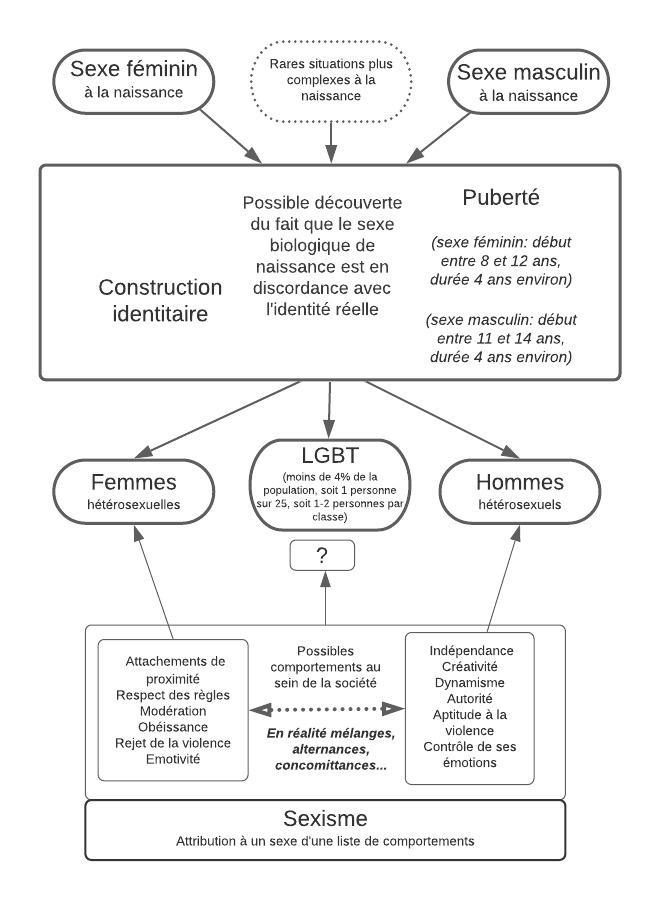 Ensuite vient la vie. Le sexe biologique ne pose pas de question dans l’écrasante majorité des cas. Mais pour moins de 5% environ des individus (proportion très stable, quelle que soit l’époque, quel que soit le lieu sur Terre) il y a non concordance.