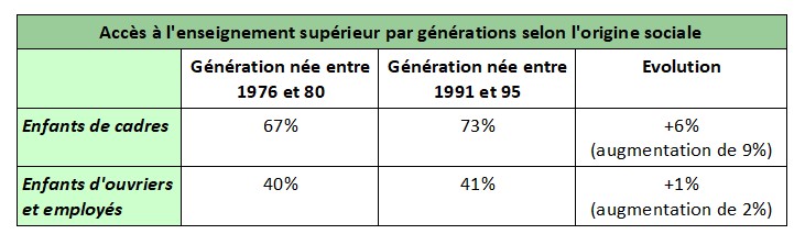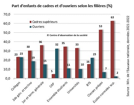 Au total, la France donne plus à ceux qui ont intégré les filières d’élite, sans se focaliser sur la réussite initiale de tous. Jean-Paul Delahaye parle même de « redistribution à l’envers », puisqu’un élève de milieu populaire recevra, en investissement éducatif de la nation, trois fois moins qu’un enfant de cadre qui après avoir fréquenté les coûteux établissements du centre continuera ses études plus longtemps.